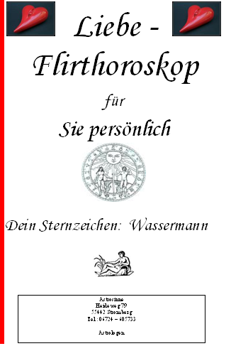 In diesem Horoskop erfahren Sie alles über Ihr Liebesverhalten, Ihre Leidenschaft und wie Sie sich in einer Partnerschaft verhalten. Dieses Liebe - Flirt Horoskop zeigt fast alle ihre Vorlieben und Schwächen in den Bereichen Romantik, Flirt und Liebesleben!